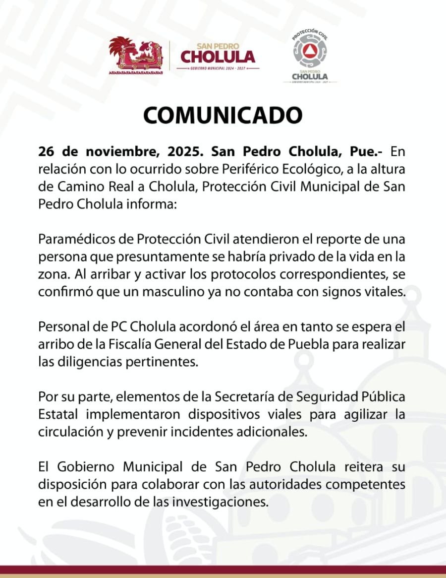 El Gobierno Municipal de San Pedro Cholula reitera su disposición para colaborar con las autoridades competentes en el desarrollo de las investigaciones.