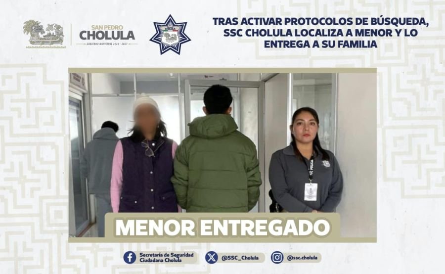 29 de noviembre, 2025. San Pedro Cholula, Pue. - Policías Municipales de la Secretaría de Seguridad Ciudadana (SSC Cholula) localizaron a un menor reportado como desaparecido, luego de activar de manera inmediata los protocolos de búsqueda en San Pedro Cholula.