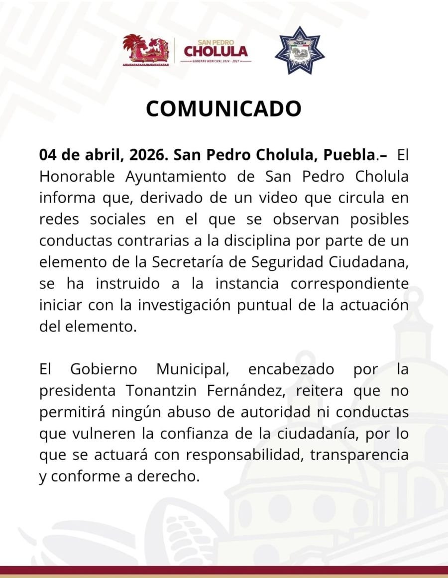 4 de abril, 2026. San Pedro Cholula, Pue.- El Honorable Ayuntamiento de San Pedro Cholula informa que, derivado de un video que circula en redes sociales en el que se observan posibles conductas contrarias a la disciplina por parte de un elemento de la Secretaría de Seguridad Ciudadana, se ha instruido a la instancia correspondiente iniciar con la investigación puntual de la actuación del elemento.