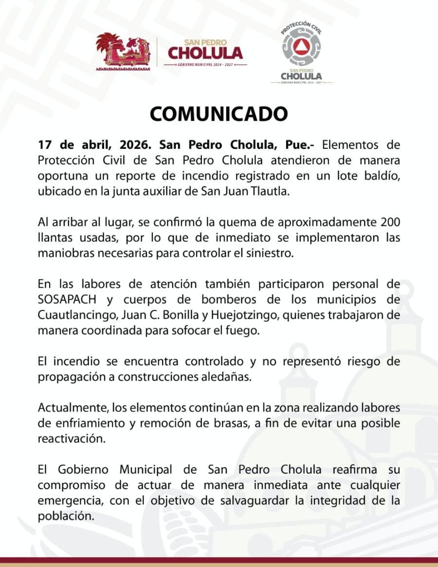 El Gobierno Municipal de San Pedro Cholula reafirma su compromiso de actuar de manera inmediata ante cualquier emergencia, con el objetivo de salvaguardar la integridad de la población.
