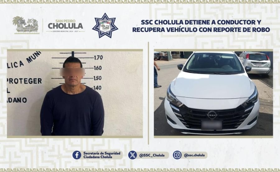 22 de enero, 2026. San Pedro Cholula, Pue. – Como resultado de los recorridos de vigilancia permanente, elementos de la Secretaría de Seguridad Ciudadana de San Pedro Cholula (SSC Cholula) detuvieron a Javier Idalio “N”, de 41 años de edad, por su probable participación en el delito de detentación de vehículo con reporte de robo, logrando además la recuperación de la unidad.